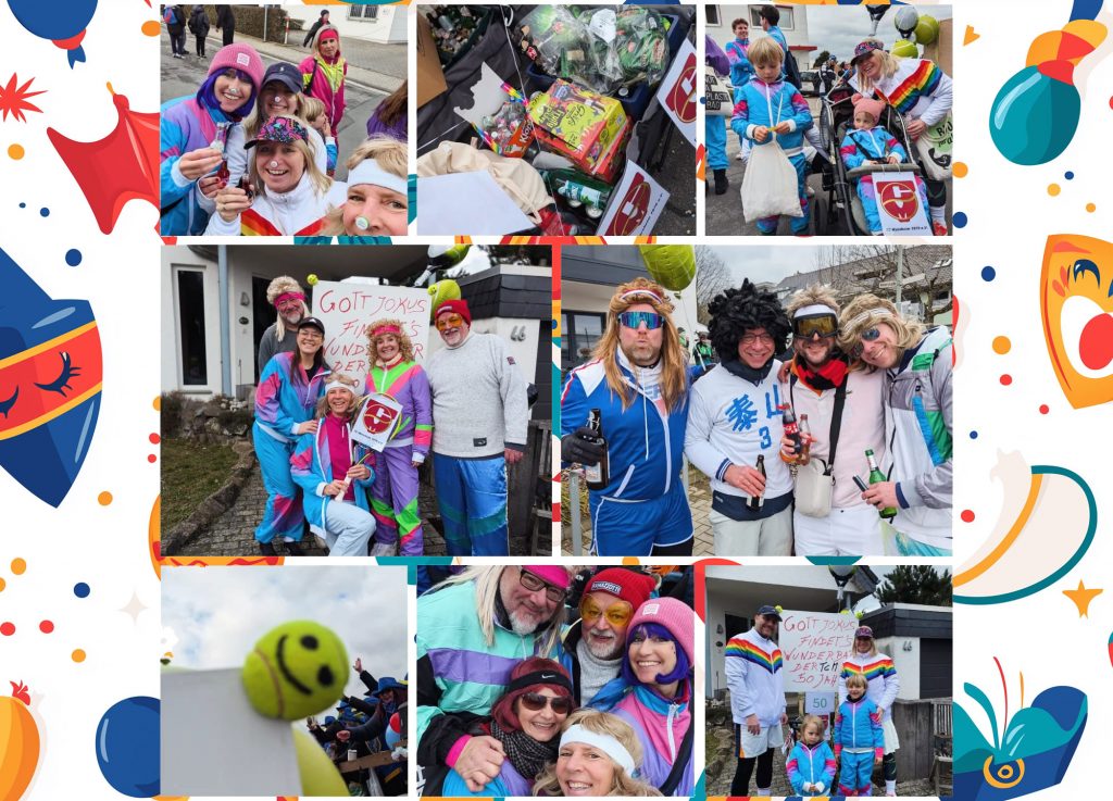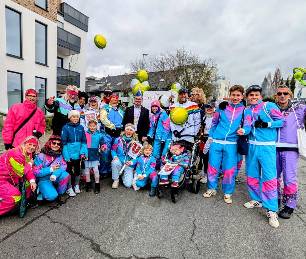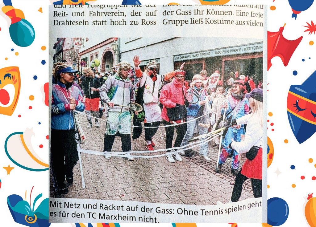 Mit Netz und Racket auf der Gass: Ohne Tennis spielen geht es für den TC Marxheim nicht. Im Retro-Style repräsentierten über 20 Mitglieder des TCM den Verein beim Fastnachtsumzug in Hofheim. Eine Mords-Gaudi war es auf jeden Fall. Schön, dass ihr dabei wart! #tcmarxheim #welovetennis #retro #fastnacht #spaß #bestervereinderwelt