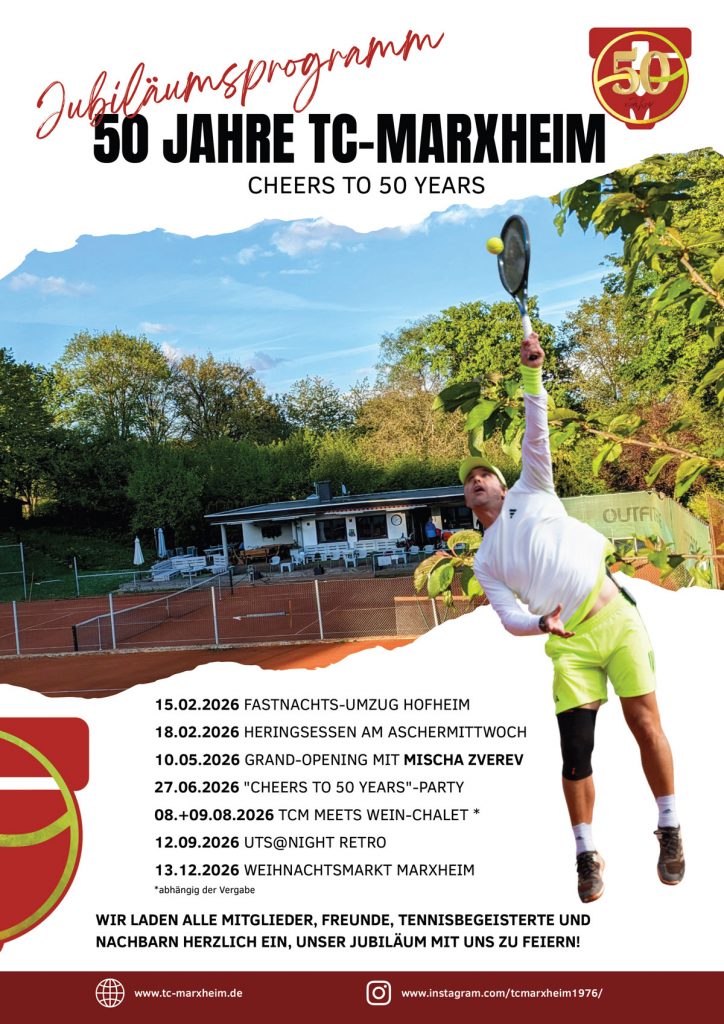 50 JAHRE TC MARXHEIM! In unserem Jubiläumsjahr könnt ihr euch auf viele Highlights freuen. Das Grand-Opening mit Mischa Zverev findet am 10.5. statt! Mehr Infos zu den Events findet ihr hier im aktuellen Programmflyer 2026 (#bestevereinderwelt):